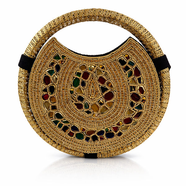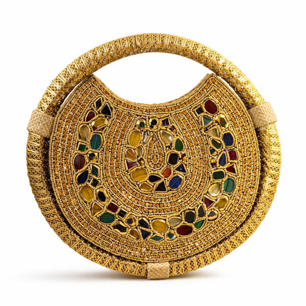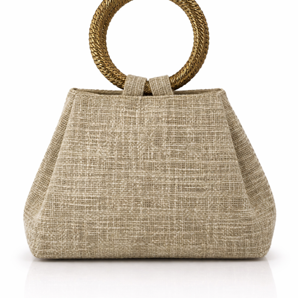 Bolso beige artesanal con asa circular dorada