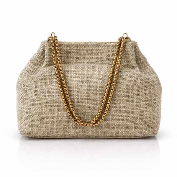 Bolso beige elegante artesanal con cadena dorada