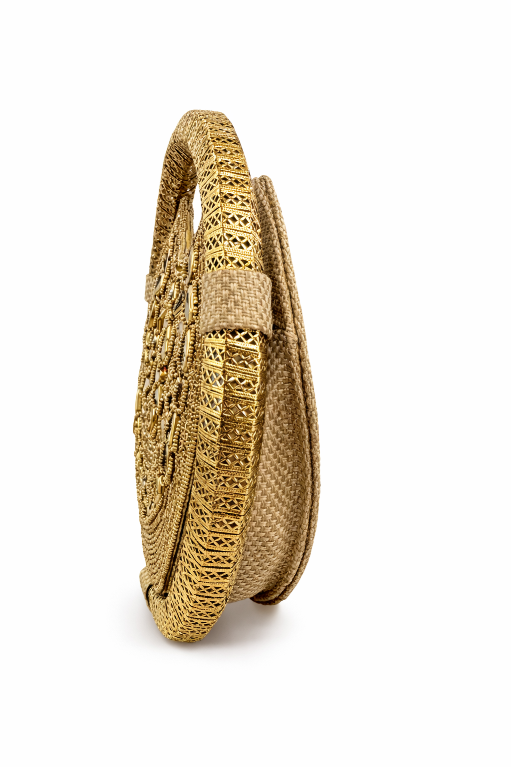 Bolso joya confeccionado a mano, con pedrería de colores y asa haciendo la forma en redondo dándole un toque muy original, único y especial.